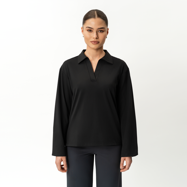 - Polo collar with open neckline for a modern, effortless look